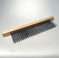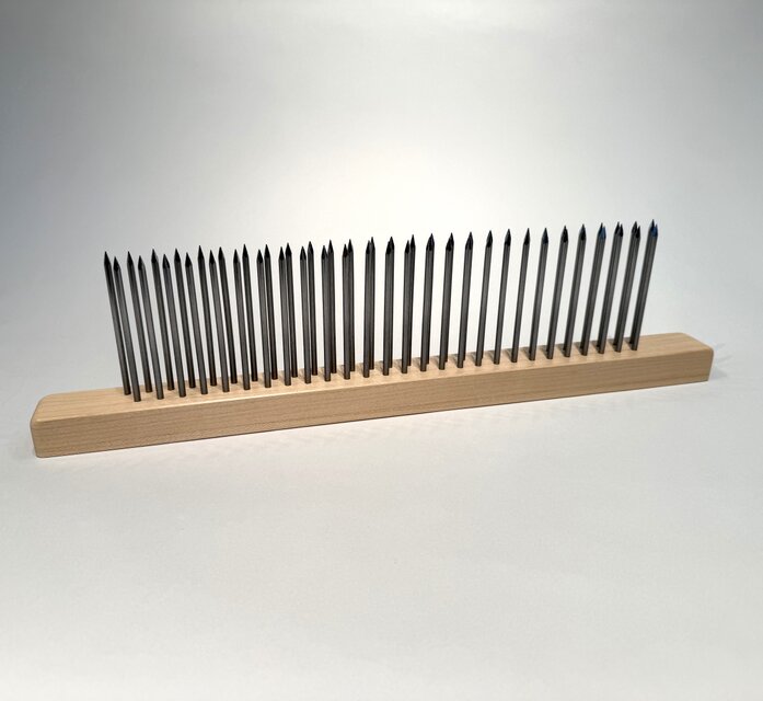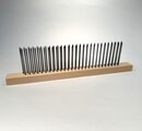 コーミングやブレンディング作業に使用する道具です。テーブルに固定してカードした羊毛を引っ掛けてディズの穴を通して引き出して使います。