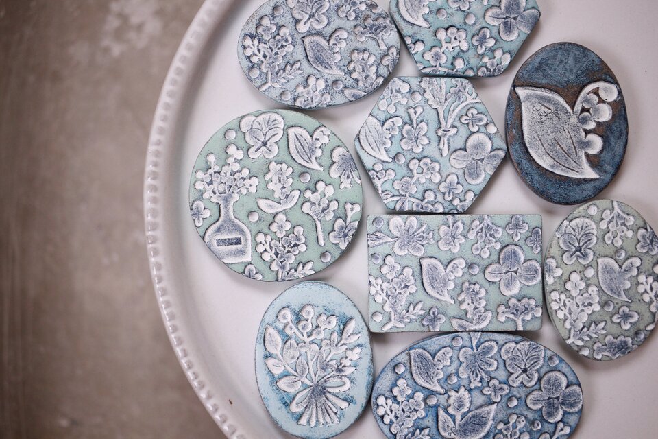 陶土にオリジナルの草花の消しゴムはんこを捺したブローチです。