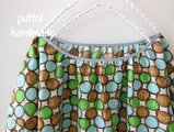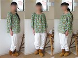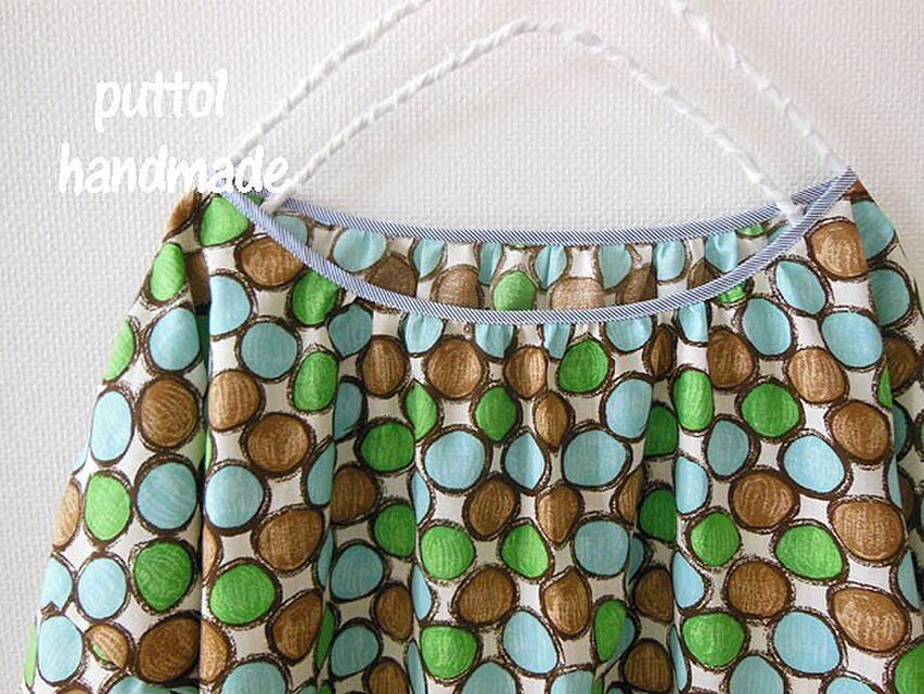 襟ぐりと袖口にはギャザーを入れて ブルーのピンストライプ地で始末しましポイントにしました。8分袖です。