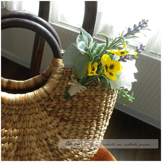 可憐な野の花のコサージュを添えたこれからの季節大活躍のカゴバッグが仲間入りです♪