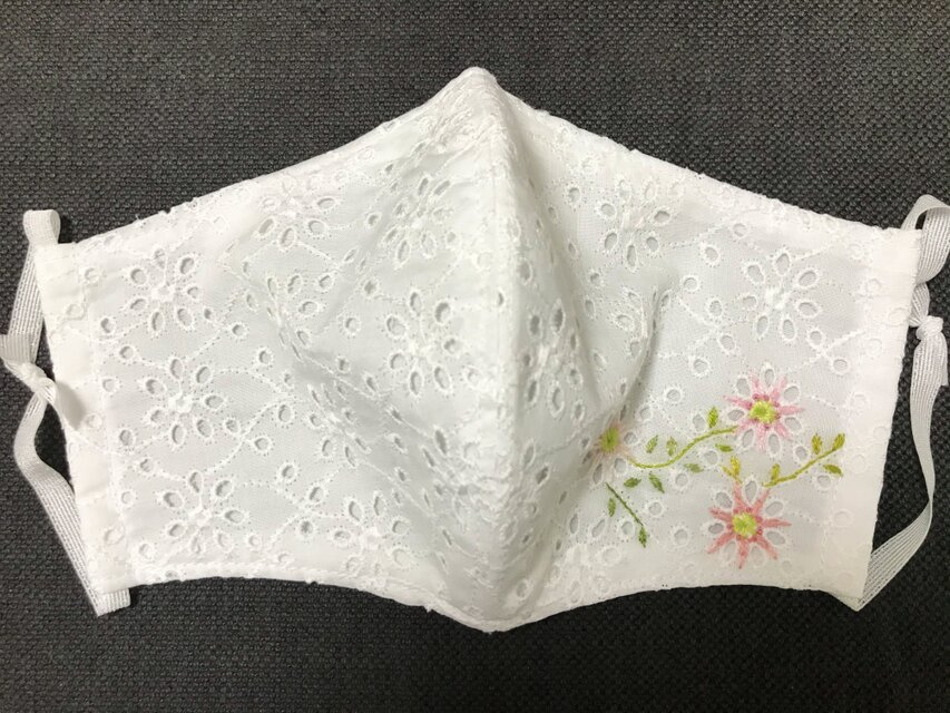 コットン100%の白レース生地に、ワンポイントの花の刺繍(左右)が入っています。