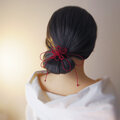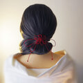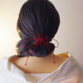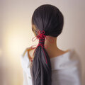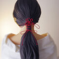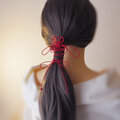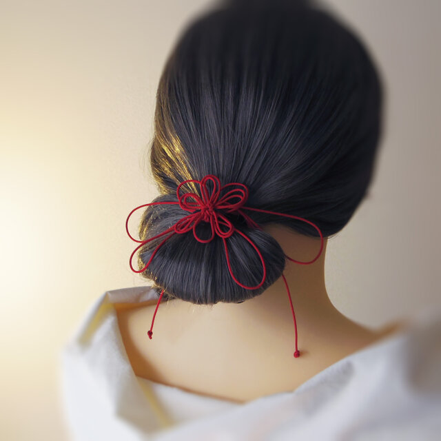 まず最初にゴム部分で髪をまとめ、垂れている紐部分をそのゴム部分の上から巻きつけて使用することにより「和」な雰囲気のまとめ髪を楽しもうと言う趣向で作りました