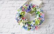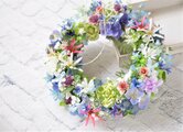 リース素材:アーティフィシャルフラワ-(造花):ネリネ・ローズ・アストランティア・レースフラワー・ブバルディア・小花・アジサイ・ハートカズラ・ミント、など。その他:ブルーのリボン飾り、シフォンのリボン飾り(シフォンのリボン飾りは取り外しできます)など。
