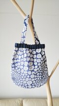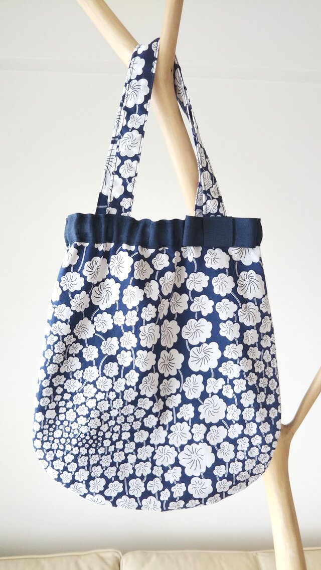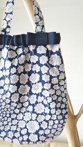 表布は人気のリバティのグランドロイオール(ブルー系)、裏布はチェック&ストライプのやさしいリネン(ネイビー)で作ったバックです。