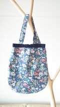 表布は人気のリバティのファーガス(ブルー系)、裏布はチェック&ストライプのやさしいリネン(ブルーグレー)で作ったバックです。