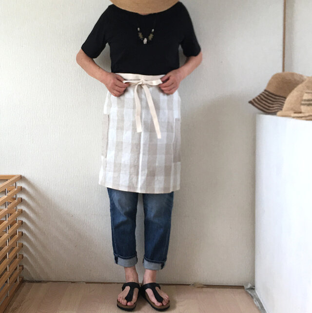 カフェエプロン フラックスカラーチェックは4種類の長さでお作りいたしました。これは二番目に短く54cmです。