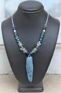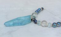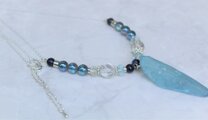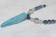大きめでクオリティの高いアクアオーラレムリアンクォーツのポイントです。組み合わせたのは、6mmのソーダライト、6x9mmのブルートパーズの間に10mmの水晶、8mmアクアオーラのビーズ。存在感のある一点に仕上がりました。