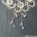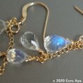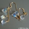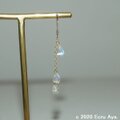 ピアスパーツにチェーンを下げ、片耳に3個、合計で6個の最上級レインボームーンストーンを、耳に近い部分が大きく、サイズグラデーションになるようにさげました。