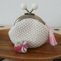 ホワイト×ピンクのシンプル可愛い手編みのぷっくりがま口ポーチです。