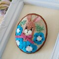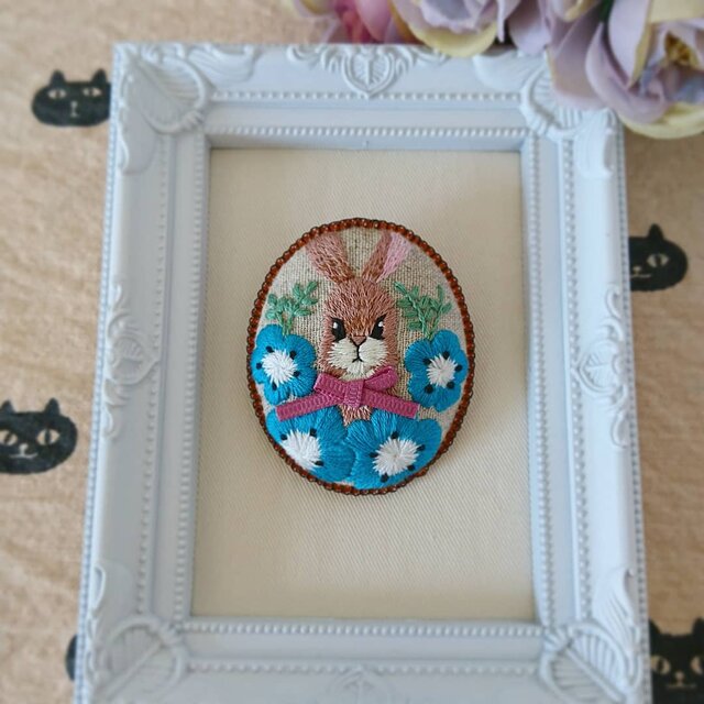うさぎさんとネモフィラを刺繍したオーバル型のブローチです。