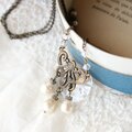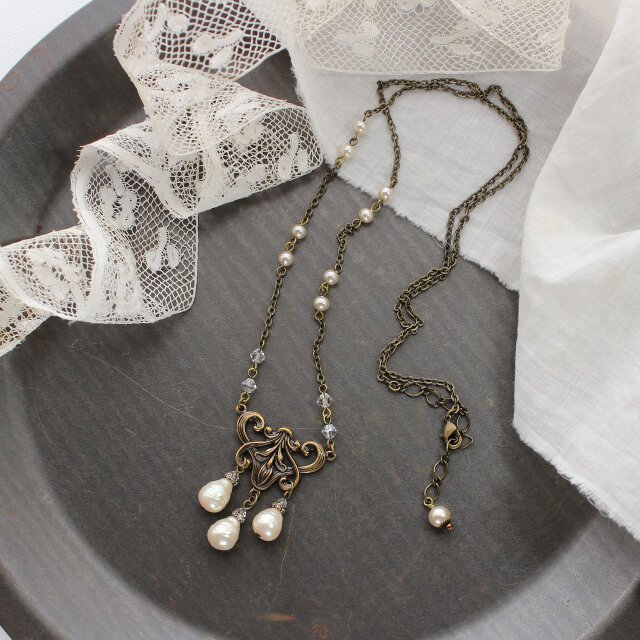流れるようなラインが美しいコネクターに、雫のようなバロックガラスパールを揺らせた、アンティークテイストなネックレスです。