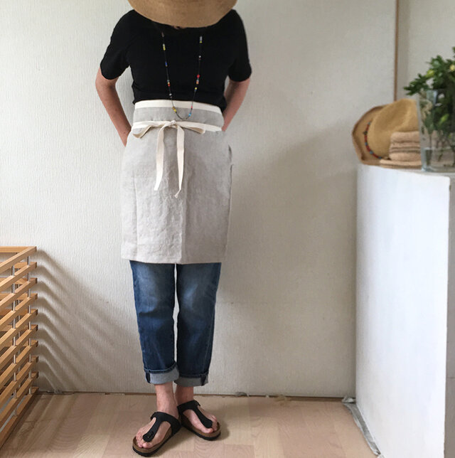 ざっくりしたリネンスラブキャンバス(リネン50%、ラミー50%)で、カフェエプロンを作りました。