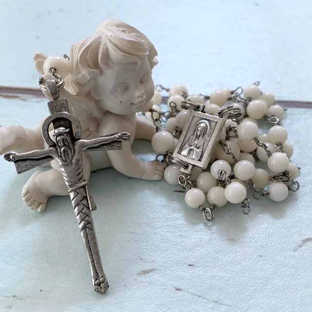 アイボリーの柔らかな色合いのコーラルを使用したとても優しい雰囲気のロザリオです。