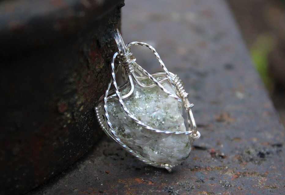 サンダ・ローザ・アゼツライトのキラキラなタンブルを、シルバーのワイヤーで巻きました。