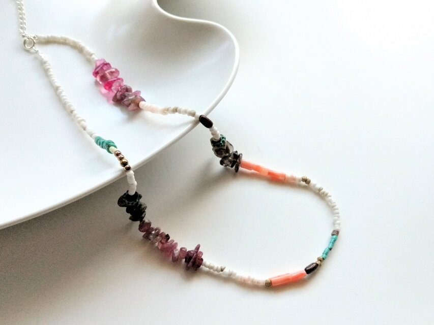 ウッド、ターコイズ、ジェイド、トルマリン、珊瑚など色々な形や色のパーツをランダムに配置したショートネックレスです。 留め金具はSV925を使用しております。