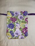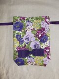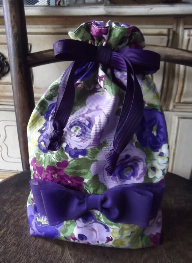 パープル系の花柄のオックス生地の巾着です。紫のシフォンのリボンをつけています。