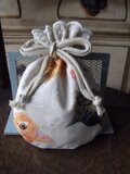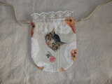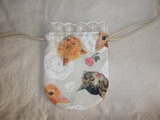 子ねこ柄のリネン地の巾着です。麻色の綿レースのフリルをつけています。