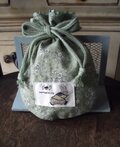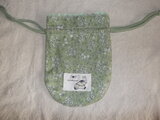 ウサギのタグが付いたグリーンの小花柄のブロード地の巾着です。グリーンの蛇腹テープをフリルに挟み込んでいます。
