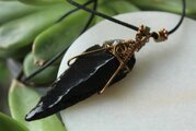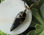 ブラックオブシディアンの矢じりを、アンティークゴールドのワイヤーで巻いてネックレスにしました。アンティークゴールドパーツに黒の皮ひもを付けました。