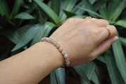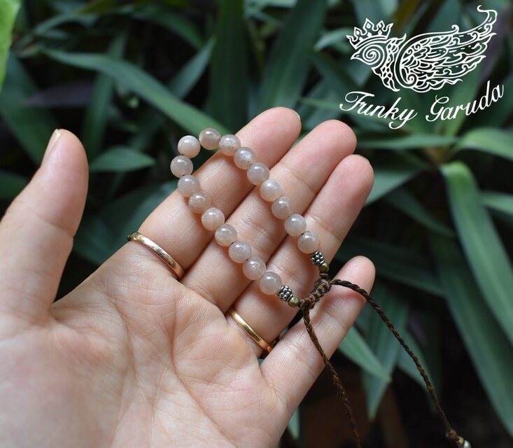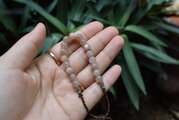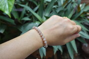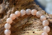 ピンクムーンストーンビーズはチョコレートムーンストーンとも呼ばれており、ちょっぴりピンク色の石の中からキラキラとシラーが輝くことから、昔から女性に親しまれてきた天然石です。やわらかいイメージで優しく光る天然石です。