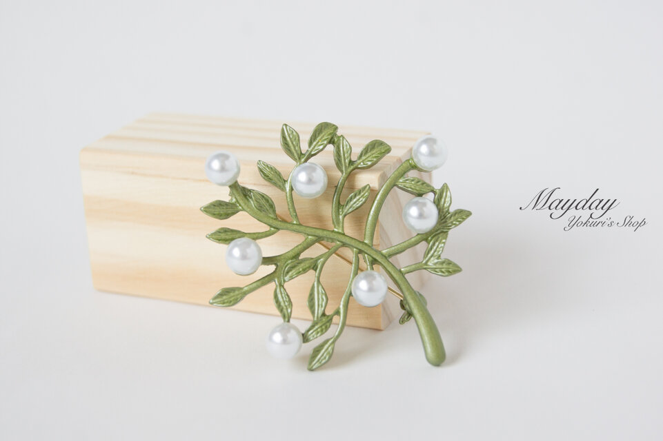 『優雅なブローチシリーズ』新緑〜グリーン枝とパールのブローチ帯留め