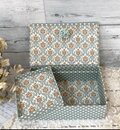 ブルー系のダマスク柄の生地と同系色のドット生地を使って製作した裁縫箱です。