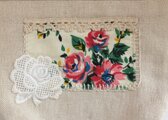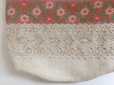 切りっぱなしのアンティークファブリックの上にブランケットステッチで仕上げました。