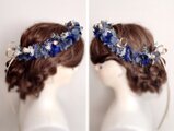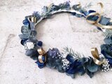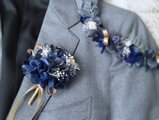 ブルーグレーをベースに、ゴールドと白を上品にコラージュしたクラシカルな花冠&ブートニアの2点セットです。