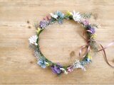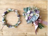 デージーやローズマリーなどを使い、華奢でナチュラルに仕上げた花冠&ミニブーケの2点セットです。