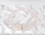 光沢の美しいローズクォーツとナチュラルカラーの本真珠(淡水)、真珠光沢の綺麗な貝パーツ、丁寧なカットによる輝きの綺麗な水晶を使ったネックレスとブレスレットのセットです。ブレスレットはリボンをモチーフにしています。