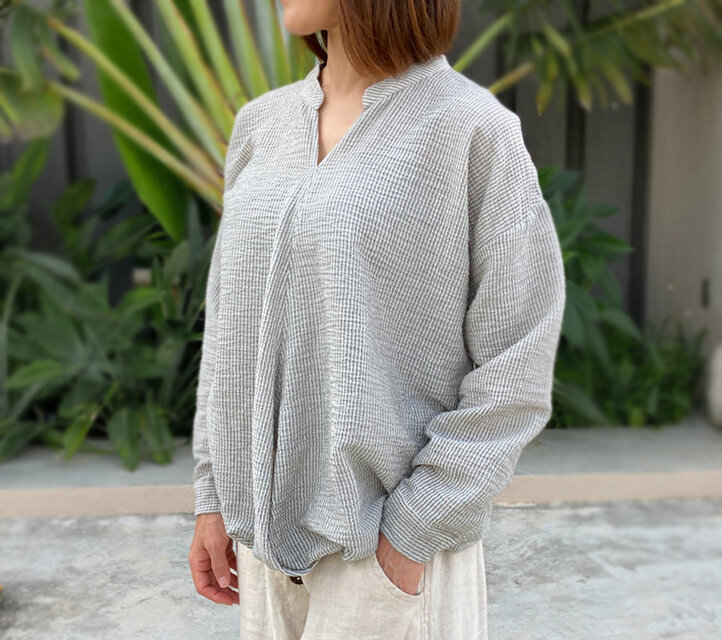 凹凸のあるクレープコットンで仕立てた長袖ブラウスは、肌にまとわりつかず爽やかな肌さわり。薄手の柔らかな布を使っているので綺麗にドレープが出ています。
