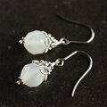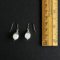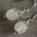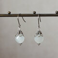 大粒のホワイトムーストーンに銀のビーズキャップを組み合わせたピアスです。ビーズキャップ、スペーサー、飾りピンは銀を、ピアスフックはステンレス(SUS316)を使用しています。
