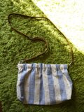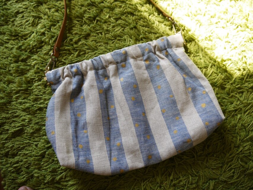 自然なリネン色/ブルーのストライプに、手描きでゴールドのドットを配しました。