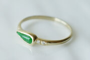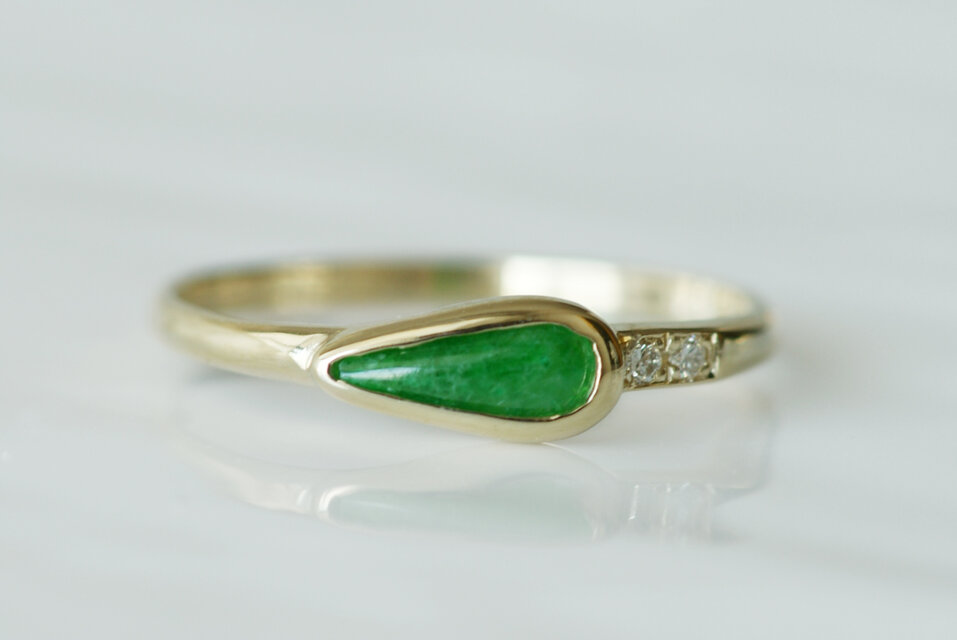 ペアシェイプの翡翠を横向きに、片側にはダイヤモンドを2石留めました。