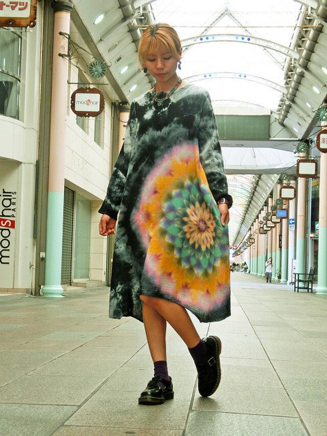 ハンサム染め最新作!!新型ヘンリーネック長袖ワンピース♪ブラックビューティ☆幻想的な大曼荼羅☆ HD11-96