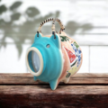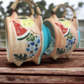 スイカにぶどう、レモンにモンステラなど夏を感じるモチーフを鮮やかに描き、涼しげなターコイズブルーの顔がアクセントに。