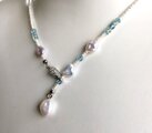 白や水色の淡水ケシパールに天然石を交え、清らかな水の流れる様をイメージしたネックレスを作りました。爽やかで涼しげな色味と軽やかでスタイリッシュなフォルム。水が形を変えるように、ネックレスもリバーシブルでY字と丸首が楽しめるデザインにしています。クリップ式の留め具なので楽々と長さを微調節できますよ。