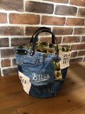 ジーンズを解体しアルバートンのアーミーダック生地と革でつぎはぎした1点物のバッグです。所々にステンシルを施しています。