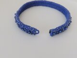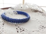 ブルーの編地に同系色のビーズを刺繍し、夏の装いのアクセントになります。
