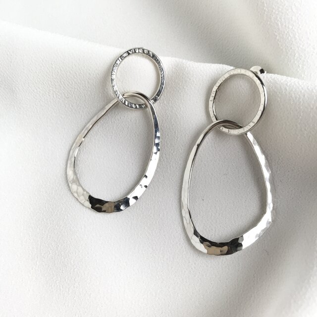 Silver950 の丸線に槌目を施し、変形楕円が下がって揺れるピアスです。
