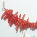 ネックレスの中心になるように、チェーンに下げたスリーピングビューティーのスライスを、紅珊瑚のチップを通しながら下げています。