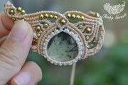 このたびはキャラメル、生成りカラーの2色の蝋引き糸を使用しマクラメ編み装飾を施しました。