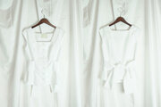 前ボタン開きで、後ろウェストのリボン結びで絞りを調整する仕様です。