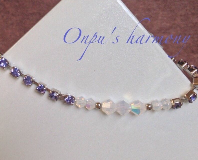 ブルーサファイア色のラインストーンがキラキラと綺麗なブレスレットです。