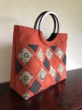 朱赤の無地帯地に、花柄と細縞、本体と同じ朱赤の帯地を剥ぎ、テープで止めたデザインの手提げです。今回は斜めにテープで止めてみました。とてもしっかりした作りになりました。