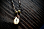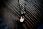 ラッキーシェル貝殻とチベット産ターコイズを合わせて、シンプルであり自然を感じられる色合いを大切にした自然派ネックレスを仕上げました。お肌に優しい蝋引き糸をしておりますので、肌荒れなどもなく敏感な方にもお使いいただける優しいネックレスです。