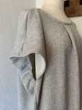 普通のフレンチスリーブに見えますが、後ろ袖口を織り込み、更に奥にゴムを通すことで立体感が生まれ、二の腕を目立たせない工夫をプラスしました。