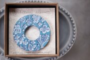 陶土にオリジナルの草花の消しゴムはんこを捺したブローチです。