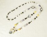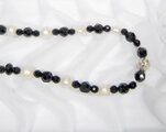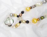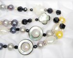 本真珠(淡水パール)、真珠光沢の綺麗な黒蝶と白蝶の貝パーツ(マザーオブパール、フラワー・モチーフ、リング)とオニキスを使ったロングネックレスです。