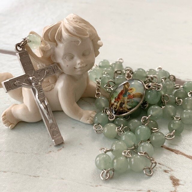 聖ミカエルのメダイの色味と石の色味がとても雰囲気の良いロザリオです。